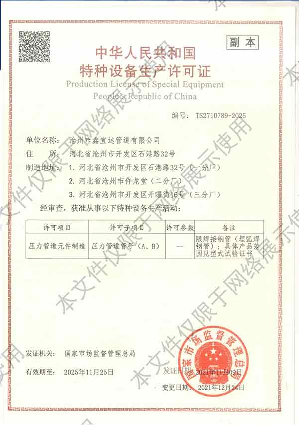 滄州市鑫宜達(dá)管道有限公司成立于2003年7月,坐落于滄州經(jīng)濟(jì)開發(fā)區(qū),占地面積40萬平方米,注冊資金1.81億元,是集螺旋鋼管生產(chǎn)、防腐加工以及無縫鋼管、卷板、帶鋼等品類鋼材經(jīng)營銷售于一體的工貿(mào)型企業(yè)。公司現(xiàn)有員工400多人,其中,中高級(jí)技術(shù)職稱的人員達(dá)120余名。 滄州市鑫宜達(dá)管道有限公司擁有9條螺旋鋼管生產(chǎn)線和3PE防腐生產(chǎn)線,可生產(chǎn)直徑219--3640mm,壁厚5.5--28mm,最高鋼級(jí)X100的各種規(guī)格防腐螺旋鋼管...